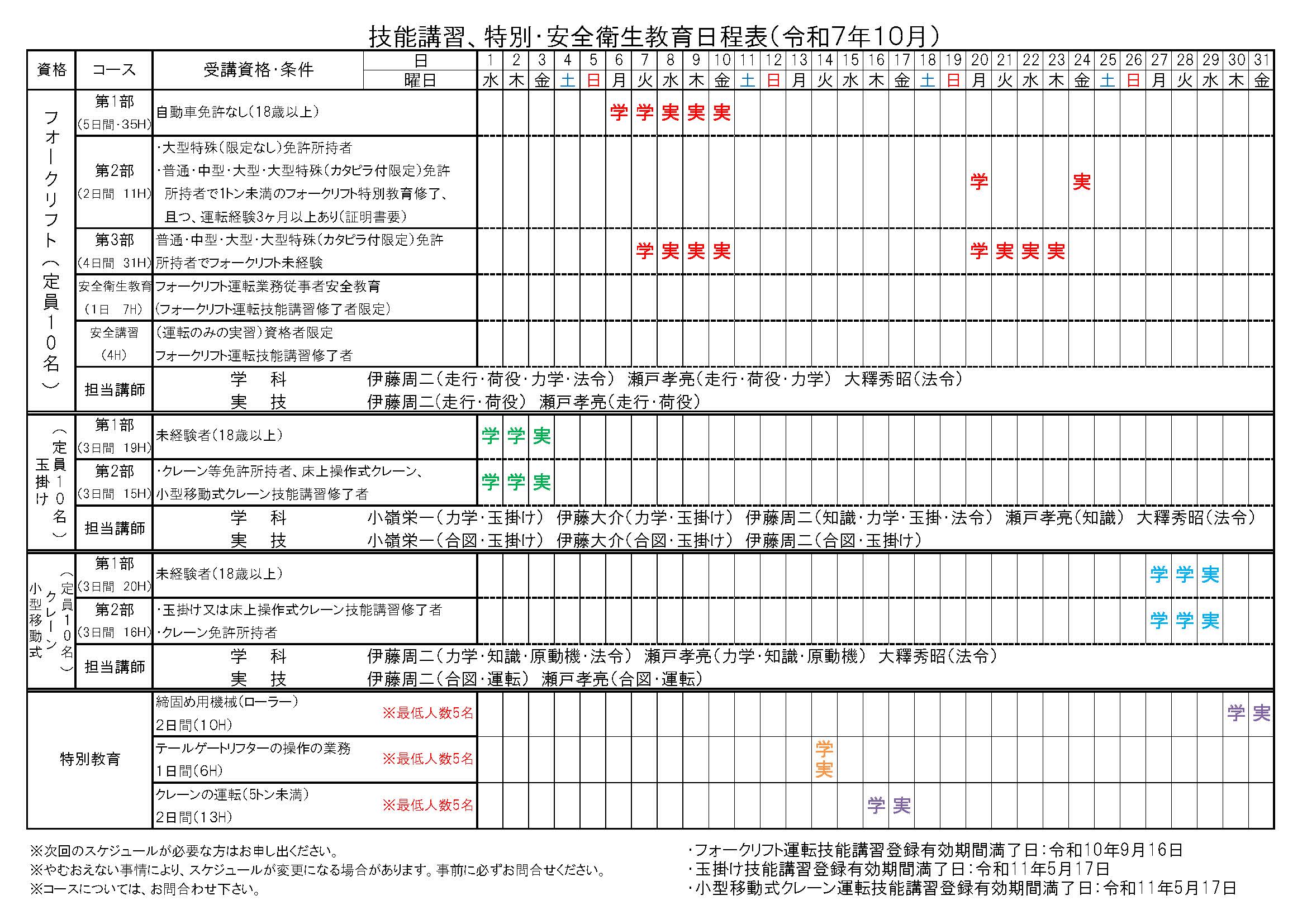技能講習、特別・安全衛生教育日程表 2025年10月日程表